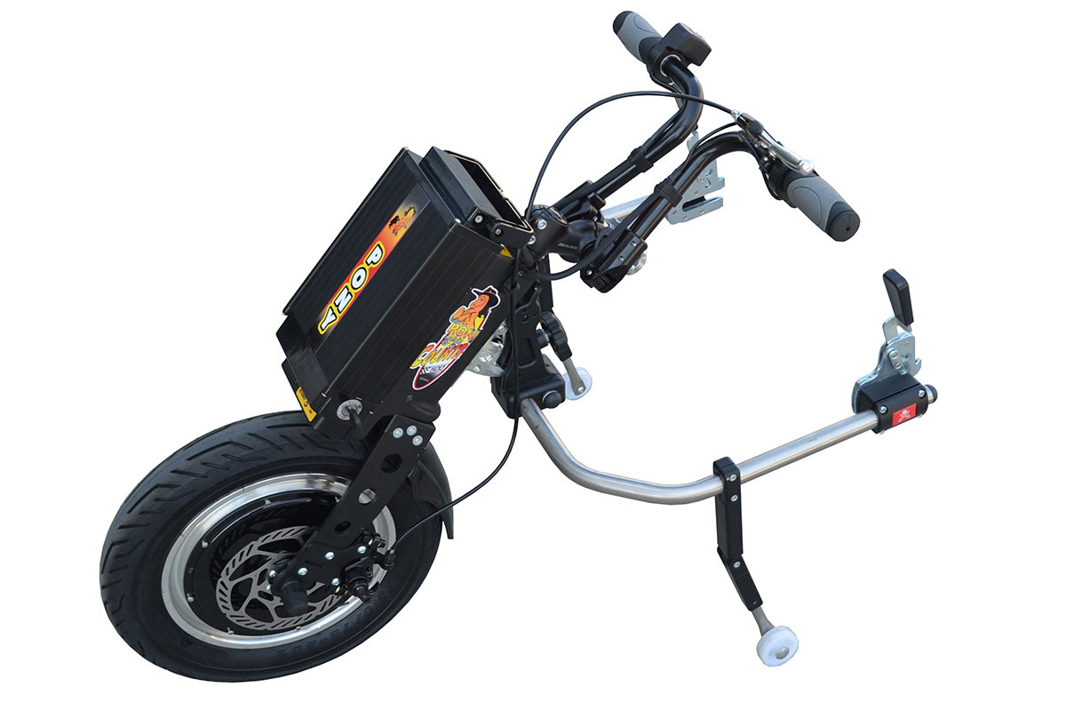 La versione con manubrio pieghevole consente, con la motoruota agganciata alla carrozzina, di avvicinarsi ai tavoli senza rimuoverla.